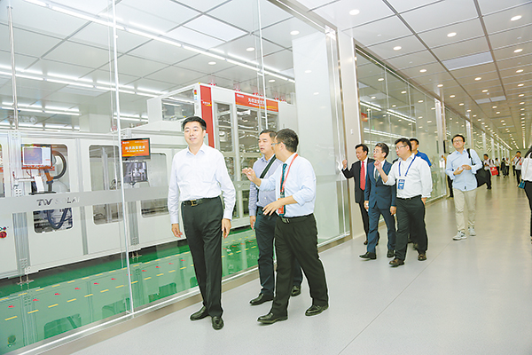 本次嘉賓們的蒞臨,不僅帶來對通威35年華誕的祝福,更共同見證了世界首條工業(yè)4.0高效電池生產(chǎn)線的正式投產(chǎn)。9月20日上午,重磅嘉賓們相繼參觀了通威集團總部的體驗中心、通威太陽能“智能制造”工廠,詳細了解了通威綠色雙主業(yè)發(fā)展現(xiàn)狀及成果、通威“漁光一體”創(chuàng)新模式。當天下午,在十一屆全國政協(xié)常委、通威集團董事局劉漢元主席的陪同下,溫氏股份名譽董事長溫鵬程、陽光電源股份董事長曹仁賢、環(huán)太集團董事長王祿寶等重磅嘉賓實地參觀了位于通威太陽能公司的世界首條工業(yè)4.0高效電池生產(chǎn)線。