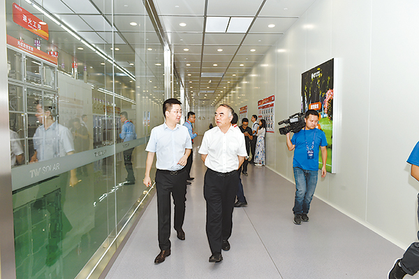 陽(yáng)光電源股份董事長(zhǎng)曹仁賢參觀通威太陽(yáng)能全自動(dòng)無(wú)人生產(chǎn)線
