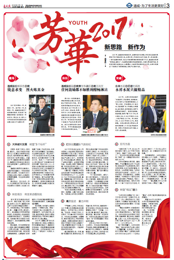 據了解,在工作計劃會期間亮相的集團及各體系年底報刊、雜志由通威傳媒擔當制作。作為集團及各體系年終總結性刊物,集團《通威報》策劃“芳華2017”專題,對集團2017年各項工作成績進行總結,并對2018各項工作計劃進行展望;各體系年底雜志分別以“澎湃吧,我們的芳華”、“致敬永祥2017”、“智造未來”為主題,對各體系一年的工作亮點和成果予以展示。一份份觀點鮮明、內容豐富的《通威報》及各體系專刊,一本本主題突出、引人入勝的各體系年底雜志,為集團工作計劃會這一重要時刻的意義做出了最佳補充與注解。
