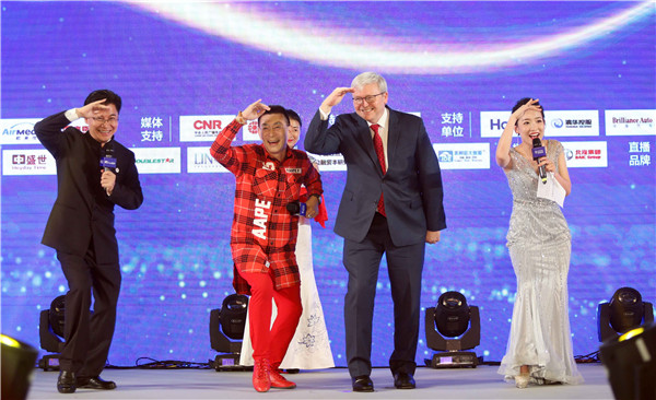 澳大利亞前總理、美國亞洲協會政策研究院院長陸克文與著名演員六小齡童在臺上互動
