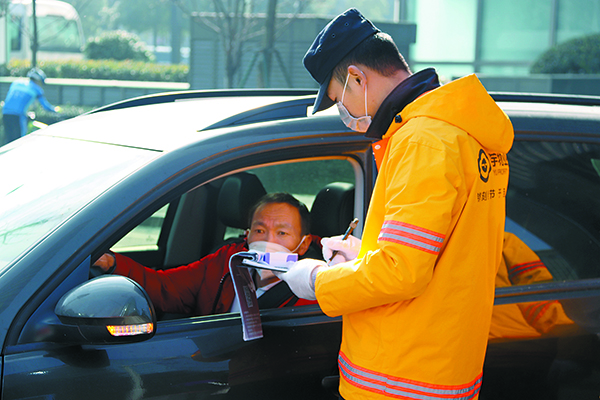 通宇物業(yè)工作人員在車輛入口登記并測(cè)量體溫