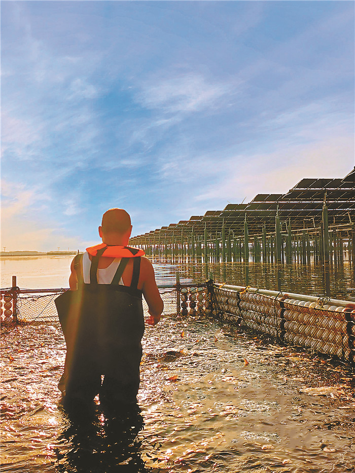 漁光物聯-漁業運營部養殖員史居正頂著烈日和熱潮,試用網箱給三標段精養區運魚苗