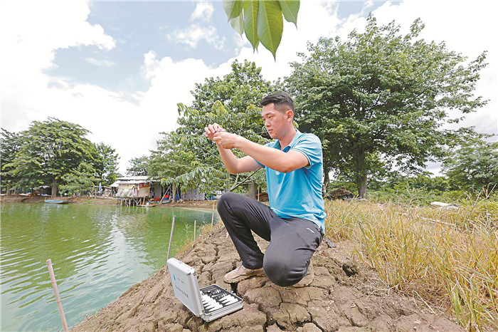 蝦特料片區陽江海壹一線服務人員頂著40度的高溫為養殖戶測水