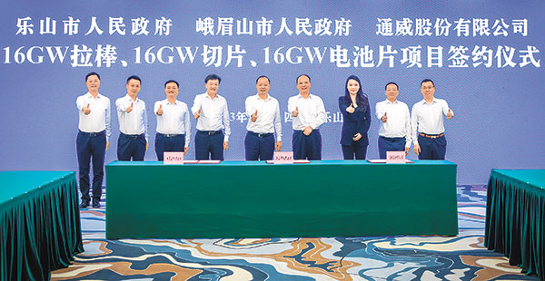 簽約儀式上,樂山市人民政府、五通橋區人民政府、峨眉山市人民政府與通威股份簽訂了《樂山市人民政府、五通橋區人民政府、通威股份有限公司16GW拉棒、16GW切片、16GW電池片項目投資協議》和《樂山市人民政府、峨眉山市人民政府、通威股份有限公司16GW拉棒、16GW切片、16GW電池片項目投資協議》。根據協議,通威股份將在五通橋區和峨眉山市分別投資100億元建設拉棒、切片、電池片項目,項目力爭 2024年底建成投產,2025年底達產。