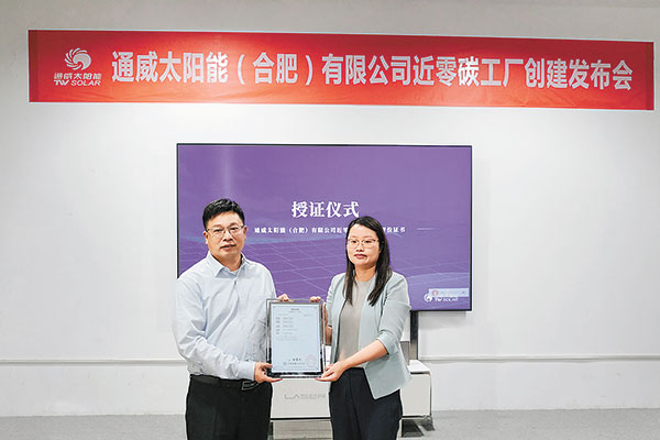 10月12日,通威太陽(yáng)能(合肥)有限公司近零碳工廠創(chuàng)建發(fā)布會(huì)成功召開(kāi)。發(fā)布會(huì)現(xiàn)場(chǎng)頒發(fā)了由中國(guó)質(zhì)量認(rèn)證中心簽發(fā)的近零碳工廠評(píng)價(jià)證書與發(fā)布會(huì)碳中和證書。蕭總指出,在“雙碳”背景下,通威既迎來(lái)了機(jī)遇,也迎來(lái)了挑戰(zhàn)。隨著通威太陽(yáng)能(合肥)有限公司近零碳工廠的創(chuàng)建,公司也將持續(xù)推動(dòng)各基地的碳管理工作,把生產(chǎn)與低碳緊密相連,提升全員環(huán)保意識(shí),創(chuàng)造全員脫碳降碳的良好氛圍。