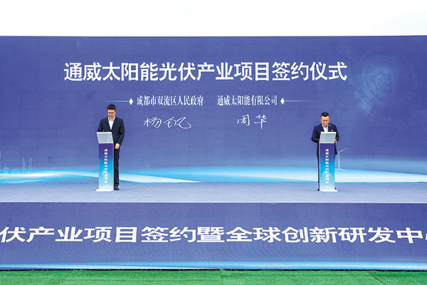 鮮榮生常委致辭表示,通威始終將科技創(chuàng)新放在企業(yè)發(fā)展的第一位,這次全球創(chuàng)新研發(fā)中心項目開工更具有標志性的意義。希望通威以此為契機,推動更多科技成果在成都發(fā)現(xiàn),更多轉(zhuǎn)化項目在成都落地。期待通威站在世界500強這個新的起點,發(fā)揮好鏈主作用,聚集更多上下游、左右岸的企業(yè)共同在成都高標準打造千億級產(chǎn)業(yè)集群。成都市委、市政府將一如既往提供最優(yōu)質(zhì)的服務,最全面的保障,支持通威成為更有行業(yè)引領力和全球競爭力的鏈主企業(yè)。劉舒琪董事長致辭表示,作為成都新能源產(chǎn)業(yè)“鏈主”企業(yè),通威聚焦產(chǎn)業(yè)鏈關鍵環(huán)節(jié),致力于推動優(yōu)勢企業(yè)集聚、協(xié)同發(fā)展,積極踐行建圈強鏈行動。此次,通威與雙流區(qū)再度攜手,簽約啟動的通威全球創(chuàng)新研發(fā)中心及產(chǎn)業(yè)化25GW電池與20GW組件項目,其中產(chǎn)業(yè)化25GW電池與20GW組件項目固定資產(chǎn)投資105億元,全球創(chuàng)新研發(fā)中心硬件投資10億元。