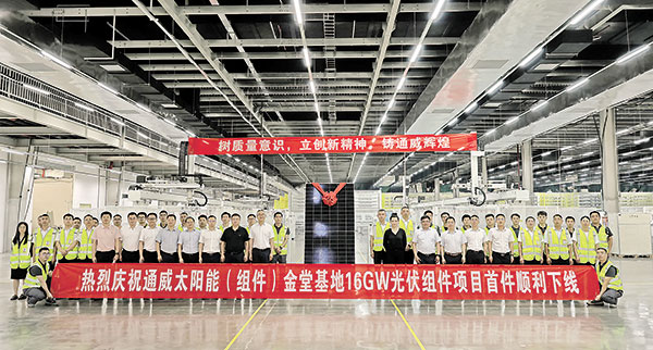 通威太陽能科技金堂基地16GW光伏組件項目首件順利下線,自設備進場安裝調試到首件下線僅用10天,刷新行業紀錄。項目建成后形成年產16GW高效晶硅光伏組件產品生產能力,將進一步完善“成都造”光伏產業鏈條。