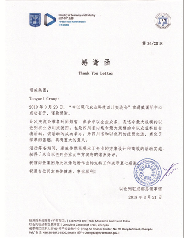 本次大會由通威傳媒提供全程支持,包括整體氛圍營造、整體視覺設計方案、高效的活動實施以及現場攝影記錄等相關服務,得到了會議主辦方高度肯定。此次活動籌備周期短、任務重,通威傳媒不懼挑戰、迎難而上、鏖戰通宵,為大會提供了高品質的整體氛圍營造、整體視覺設計方案、高效的活動實施以及完備的現場攝影記錄等相關服務,展現出超強的專業素養和服務意識,贏得了參會以色列企業及中方政府部門紛紛“點贊”。會后,以色列駐成都總領事館專程向通威集團發來感謝函,向通威集團對此次活動的全程支持表示衷心的感謝。