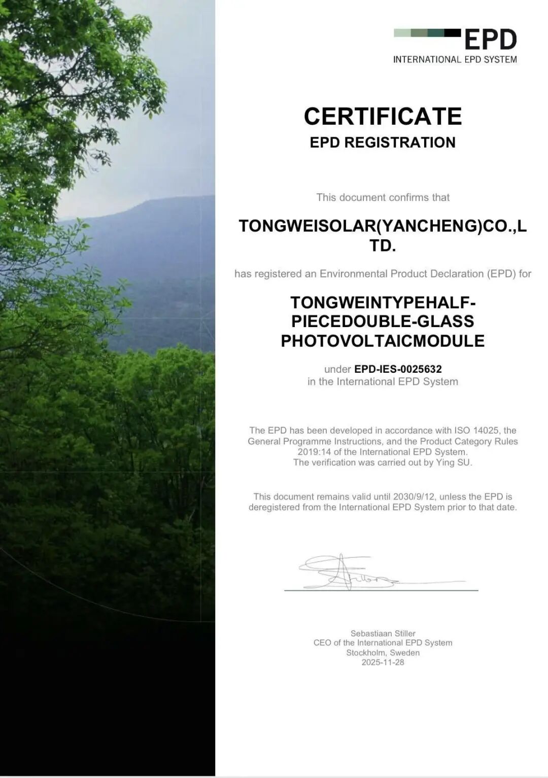 近日,通威太陽能科技鹽城基地在綠色發展領域取得重大突破,成功獲得由國際環境產品聲明(EPD)系統簽發的EPD認證證書,這不僅是鹽城基地在推進綠色制造、深化產品全生命周期環境管理的關鍵成果,也彰顯了通威踐行環境透明與可持續發展的堅定承諾。