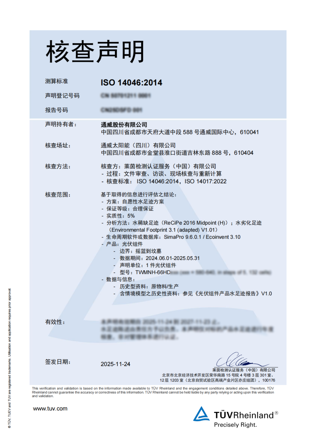 近日,國際權威檢測認證機構德國萊茵TÜV集團(以下簡稱TÜV萊茵)正式向通威四川、鹽城、南通三大組件生產基地,頒發TWMNH-66HD光伏組件產品水足跡核查聲明。作為國內光伏行業首家完成產品全生命周期核查的企業,通威憑借覆蓋“硅料-硅棒-硅片-電池片-組件”的全鏈條水資源管理能力,順利通過符合ISO 14046:2014國際標準的產品水足跡核查,不僅為自身產品注入鮮明可持續屬性,更樹立起光伏產業綠色低碳發展的行業標桿。