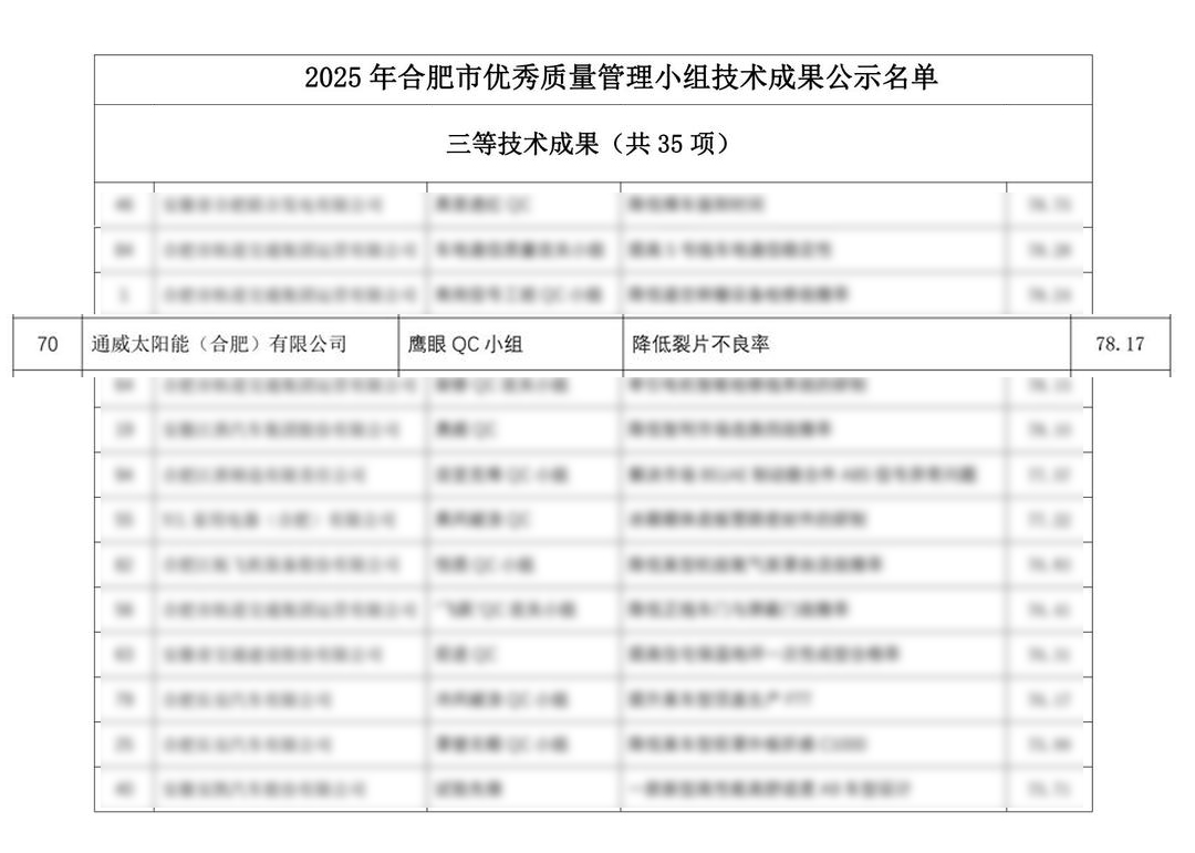 通威太陽能科技合肥基地榮獲合肥市質(zhì)量管理大賽三等獎(jiǎng)