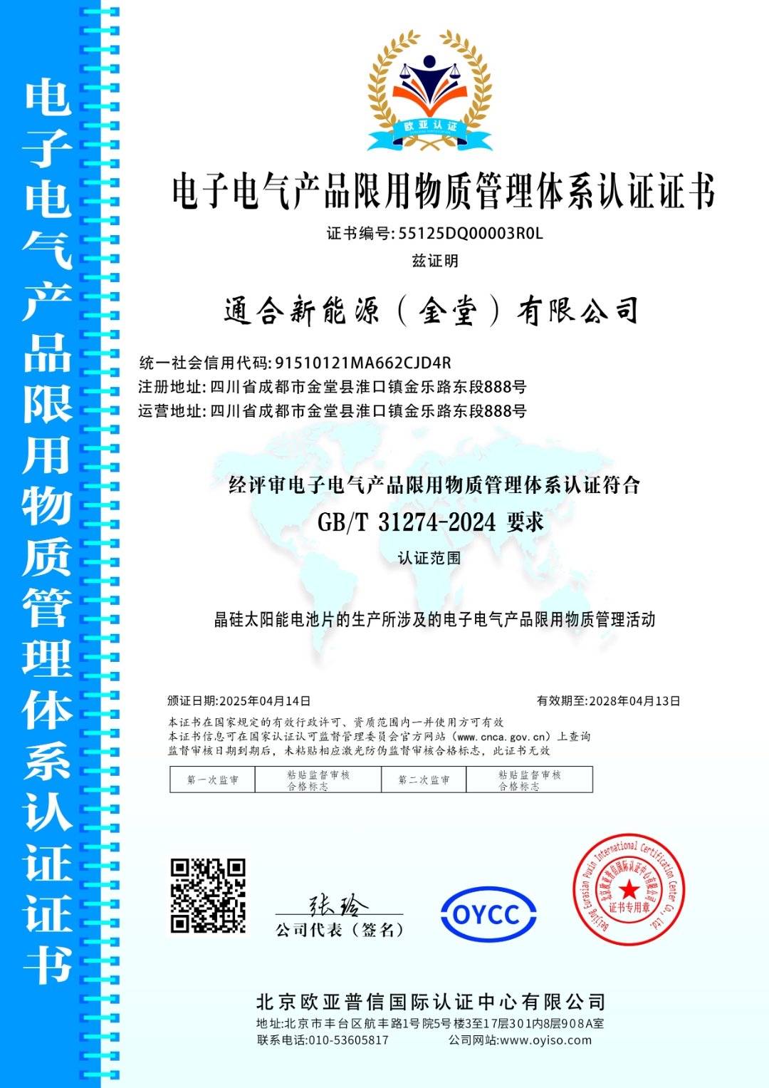 通合新能源(金堂)有限公司成功獲得電子電氣產(chǎn)品限用物質(zhì)管理體系認(rèn)證證書