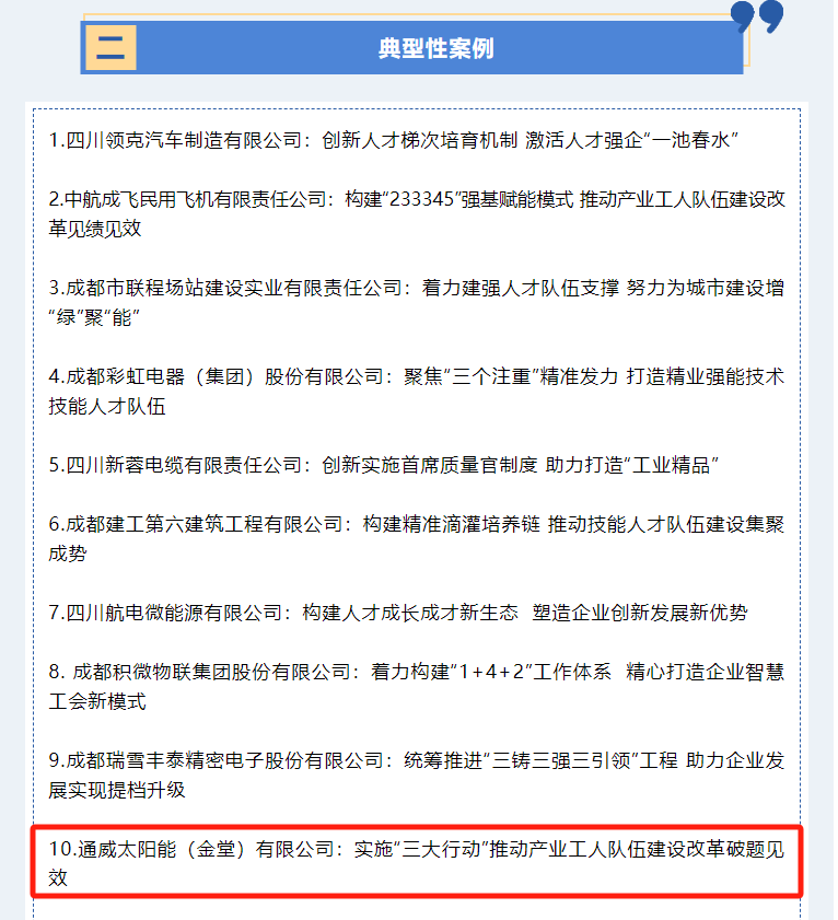 通威太陽能(金堂)有限公司成功入選市級產業工人隊伍建設改革典型案例