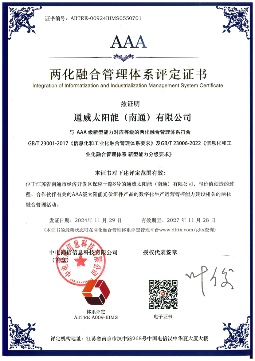 通威太陽能(南通)有限公司榮獲AAA級兩化融合管理體系評定證書