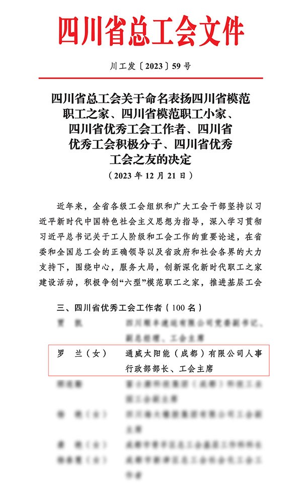 通威太陽能雙流基地工會(huì)主席羅蘭榮獲“四川省優(yōu)秀工會(huì)工作者”