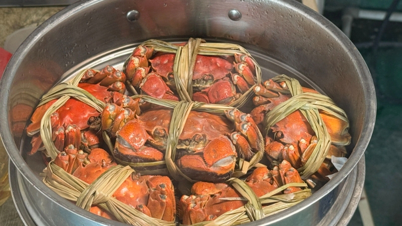 據程佑河介紹,南京作為“火城”,高溫天氣頻繁。養殖大閘蟹最頭痛的是高溫季節水草控制,而在光伏區域,有了光伏板的遮住,高溫季節塘口水溫比外界低3-5度,利于水草生存,水草保住了,水質才會好,好水質才能養出高品質大閘蟹。“高溫季節,光伏板下大閘蟹養殖不停,可促進生長,提前成熟,規格可以提一檔,相當于畝產最高可提高80斤,增加2000多元的畝效益?!背逃雍拥淖院栏辛魈试谧掷镄虚g。目前,龍袍基地的大閘蟹年產量可以達到35萬斤,借助便捷、快速的冷鏈物流走上全國消費者的餐桌。