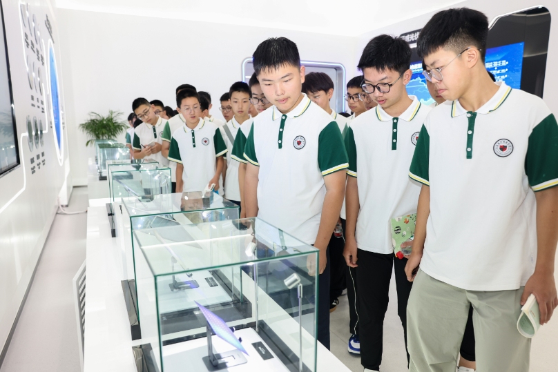 學生們走進鹽城基地,一起觀看光伏科普視頻、學習光電轉化知識、參觀生產自動化設備。講解員將生態環保知識和光伏發電原理植入到實地參觀與VR互動中,增進了學生對清潔能源的了解和認知。在這里,青少年學生充分了解到太陽光能轉化發電的科學奧秘,以及礦石轉變為電池、組件再到應用于“漁光一體”終端模式的過程,近距離觀看了車間生產現場與各類自動化設備,一睹現代化工廠與智能化制造的先進風采。