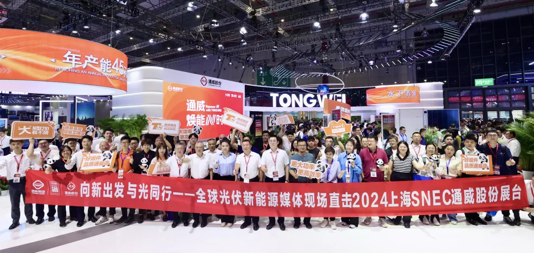 6月13日上午,SNEC PV+第十七屆(2024)國際太陽能光伏與智慧能源(上海)展覽會正式啟幕。開展首日的通威展臺上,不僅新產品精彩亮相,人氣爆棚,媒體也以最強陣容聚焦通威:現場近20家行業媒體直播通威全天活動;50余家權威媒體和行業媒體采訪通威股份光伏首席技術官邢國強博士;通威股份董事長、CEO劉舒琪與媒體團現場交流并合影留念,通威集團副總裁胡榮柱,通威集團黨委書記、副總裁黃其剛,通威股份光伏首席技術官邢國強博士、行政總監馮暢陪同;當天晚上還隆重舉行“向新出發 與光同行”2024上海SNEC通威&媒體聯誼之夜。
