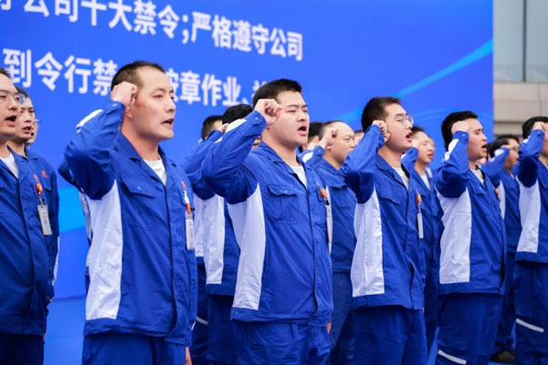 隨后,四川永祥新能源有限公司員工進行安全宣誓,承諾時刻牢記安全第一的理念,嚴格遵守公司十大禁令;嚴格遵守公司規章制度,從我做起,履職盡責,自覺做到令行禁止、按章作業、關愛生命、“四不傷害”,將安全意識貫徹到底。