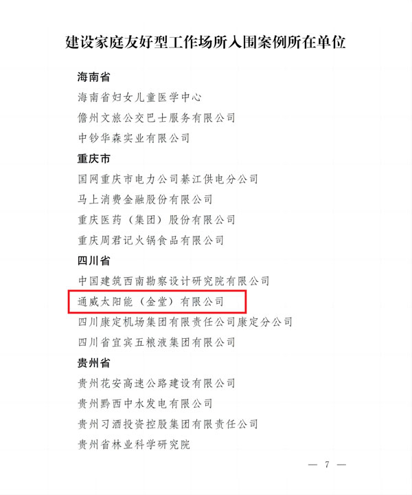 通威太陽能(金堂)有限公司入圍全國建設(shè)家庭友好型工作場所典型案例