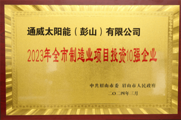 通威太陽(yáng)能(彭山)有限公司榮獲“2023眉山市制造業(yè)項(xiàng)目投資10強(qiáng)企業(yè)”榮譽(yù)
