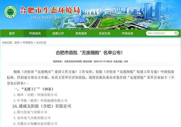 近日,根據《合肥市“無廢城市”建設工作方案》《合肥市“無廢細胞”創建工作方案》等工作部署,合肥市篩選出首批具備命名條件的“無廢細胞”名單。通威太陽能(合肥)有限公司榮獲合肥市首批“無廢工廠”稱號。這標志著公司在廢物管理和資源循環利用方面取得了顯著成效,為合肥市的綠色發展貢獻了重要力量。