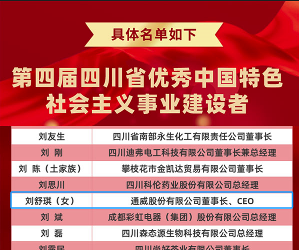 通威股份董事長、CEO劉舒琪榮獲“四川省優秀中國特色社會主義事業建設者”稱號
