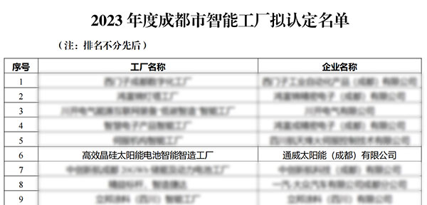 11月22日,成都市經(jīng)濟(jì)和信息化局官方網(wǎng)站發(fā)布了《2023年度成都市智能制造工廠和數(shù)字化車間擬認(rèn)定名單公示》,通威太陽能雙流基地通過自主申報(bào)、區(qū)(市)縣審核、專家組評審、現(xiàn)場評審,通威太陽能雙流基地最終被認(rèn)定為“成都市智能工廠—高效晶硅太陽能電池智能制造工廠”。