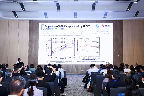 孟夏杰部長作題為《Effective boron doping of LPCVD deposited intrinsic silicon》(LPCVD技術(shù)沉積本征硅的有效硼摻雜)專題演講,分享了通威對(duì)硼摻雜多晶硅的技術(shù)研究,使用BCl3對(duì)本征非晶硅進(jìn)行摻雜,通過控制沉積溫度和退火有效控制多晶硅晶粒有效硼摻雜,硼擴(kuò)散后的p+多晶硅表現(xiàn)出良好的鈍化性能和低的接觸電阻,以此技術(shù)應(yīng)用可推進(jìn)TBC電池技術(shù)研發(fā)。目前通威在TBC技術(shù)研發(fā)已具備完善的研究中心及試驗(yàn)線,TBC研發(fā)效率p型達(dá)到了25.41%,n型達(dá)到26.5%,遠(yuǎn)超行業(yè)平均水平。
