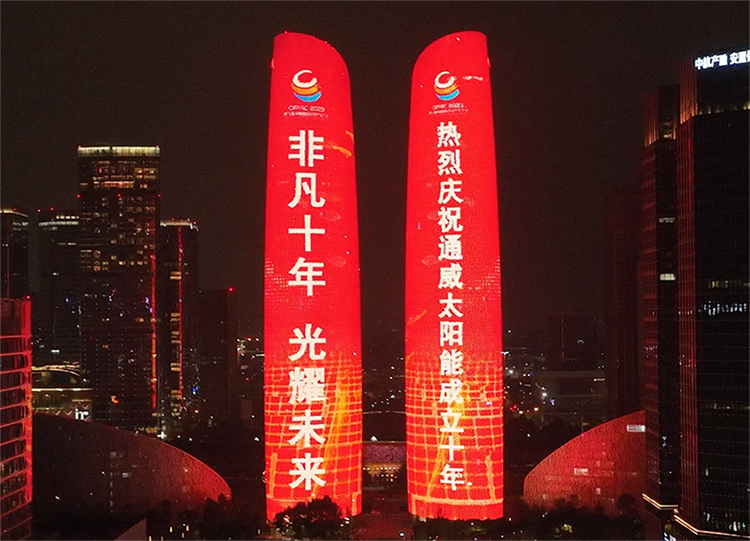 成都地標雙子塔點亮,慶祝通威太陽能成立十年