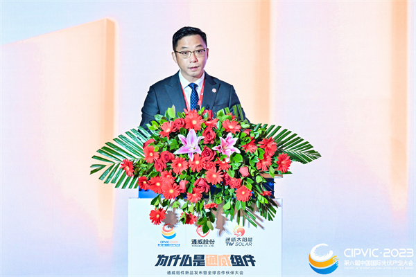 通威股份光伏商務部組件全球營銷總經理邱新在致辭中首先對蒞臨現場的領導嘉賓致以衷心的感謝,并表示,今年是通威入局組件的第一個自然年,這一年的發展離不開廣大伙伴的支持,也離不開這個沉淀定力的時代。時代為何選擇通威?選擇通威就是選擇高效、選擇誠信和選擇可靠。高效、誠信、可靠架起了合作交流的橋梁,也為共同建設綠色能源的未來、共同奔赴更美好的生活的提供了更多的選擇路徑。真誠期待與廣大行業同仁繼續攜手同行,共謀合作新篇,共繪興業愿景。