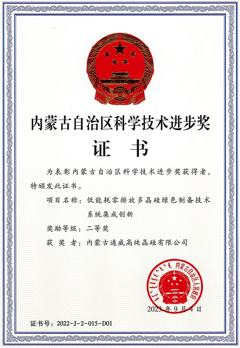 10月11日,包頭市科學(xué)技術(shù)局正式通知頒發(fā)科學(xué)技術(shù)進(jìn)步獎(jiǎng)獲獎(jiǎng)證書,內(nèi)蒙古通威高純晶硅有限公司的“低能耗零排放多晶硅綠色制備技術(shù)系統(tǒng)集成創(chuàng)新”項(xiàng)目榮獲內(nèi)蒙古自治區(qū)科學(xué)技術(shù)進(jìn)步獎(jiǎng)二等獎(jiǎng)。