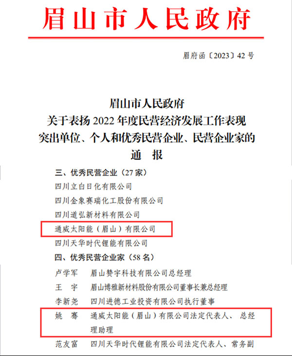 為鼓勵發展民營企業、推動全市經濟高質量發展,近日,眉山市人民政府發布《關于表揚2022年度民營經濟發展工作表現突出單位、個人和優秀民營企業、民營企業家的通報》,通威太陽能眉山基地榮獲眉山市“2022年度優秀民營企業”稱號,眉山基地總經理助理姚騫當選眉山市“2022年度優秀民營企業家”。