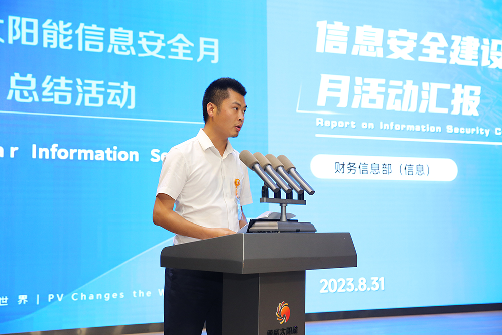 8月31日,通威太陽(yáng)能 2023 年信息安全月總結(jié)活動(dòng)圓滿舉行,此次活動(dòng)特邀黃甲派出所趙正剛警官一行蒞臨現(xiàn)場(chǎng)并開(kāi)展防詐知識(shí)宣講,通威太陽(yáng)能總經(jīng)理周華、副總經(jīng)理宋梟、總經(jīng)理助理陳君及各基地中高管團(tuán)隊(duì)、員工代表出席活動(dòng)。