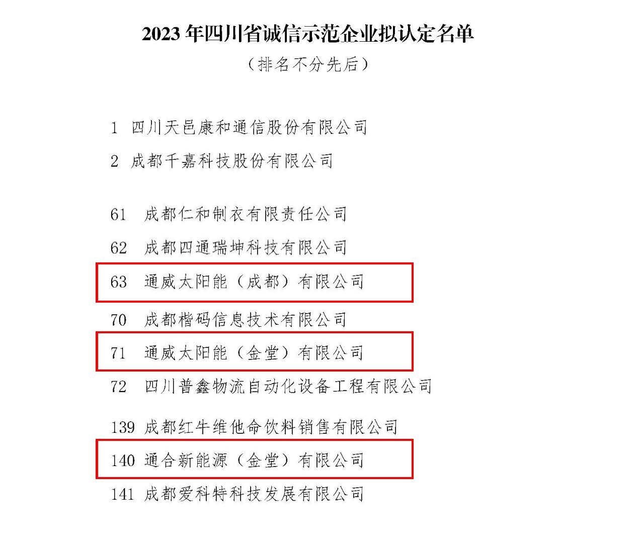 通威太陽(yáng)能三家公司上榜2023年“四川省誠(chéng)信示范企業(yè)”公示名單