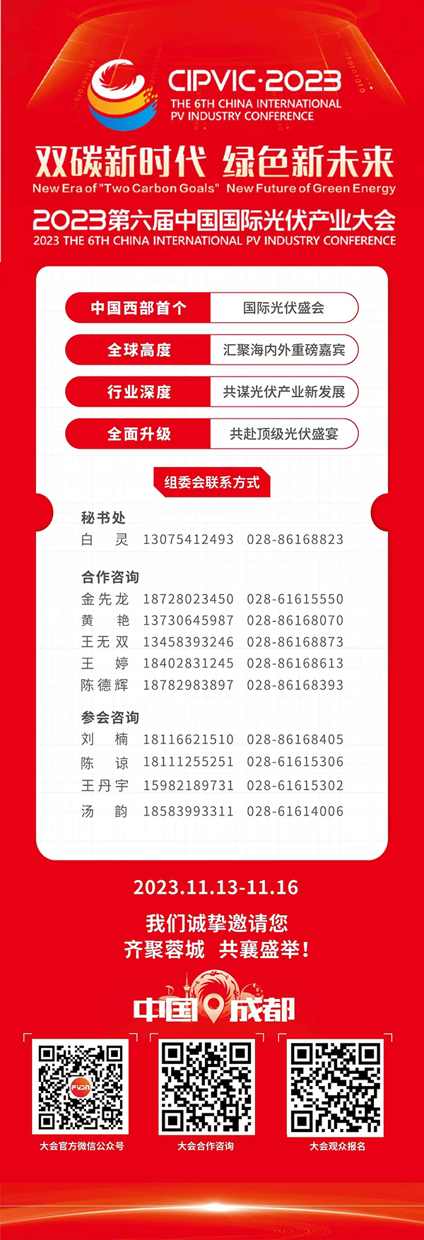 11月13-16日,2023第六屆中國國際光伏產業大會將于成都世紀城新國際會展中心隆重舉行。作為我國西部首個國際光伏盛會,大會已匯聚海內外重要領導、重磅嘉賓、行業大咖及數百家龍頭企業參與。