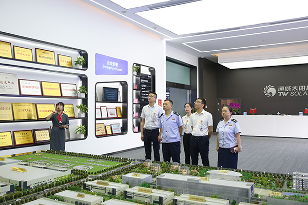 在通威太陽能雙流基地智能制造展廳,馮局長全面了解了通威的發展歷程、項目建設、產能規模、綠色發展、智能制造發展最新成果等相關情況。參觀過程中,充分肯定了通威太陽能高標準、嚴要求的現場管理水平,并對通威太陽能雙流基地作為雙流區5A級納稅企業稅收貢獻及良好的稅務管理能力、稅務配合態度給予高度評價。