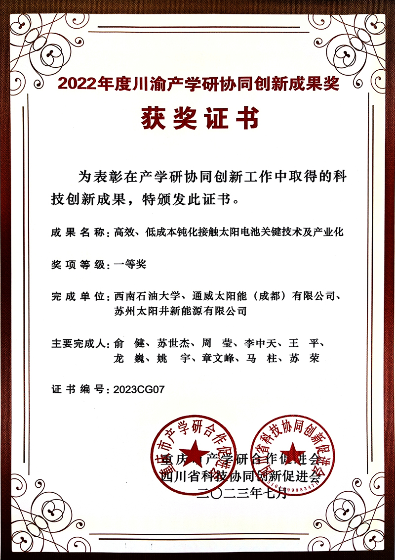 通威太陽能榮獲“2022年度川渝產(chǎn)學(xué)研協(xié)同創(chuàng)新成果獎”一等獎