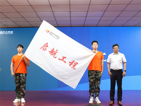 7月12日,通威太陽能(組件)2023屆啟航工程正式開營,通威股份總裁助理、通威太陽能(合肥)有限公司總經理蕭圣義、通威太陽能(鹽城)有限公司副總經理翟緒錦攜各基地管理團隊及員工代表,與500余名啟航生共同見證開營時刻。