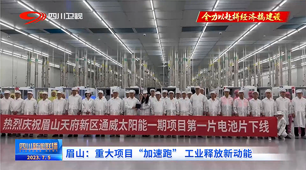 7月5日,四川衛(wèi)視《新聞聯(lián)播》、四川在線等多家主流媒體分別以《眉山:重大項(xiàng)目“加速跑” 工業(yè)釋放新動能》《四川天府新區(qū)(眉山片區(qū))首個“雙百億”項(xiàng)目正式投產(chǎn)》為題,聚焦通威太陽能彭山基地一期高效晶硅電池項(xiàng)目首片電池片下線。