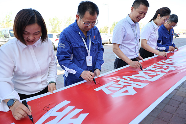 啟動儀式在安全分享和各專業組代表安全承諾發言后,由杜總帶領全體員工進行安全承諾簽名。