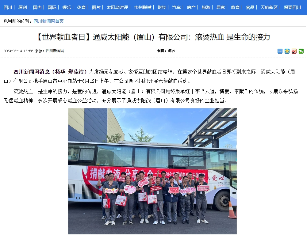 6月13日及14日,四川新聞網和雙流發布分別以《通威太陽能(眉山)有限公司:滾燙熱血 是生命的接力》《無償獻血:企業員工“擼袖子”獻愛心》為題,聚焦通威太陽能職工積極參與愛心獻血公益活動。