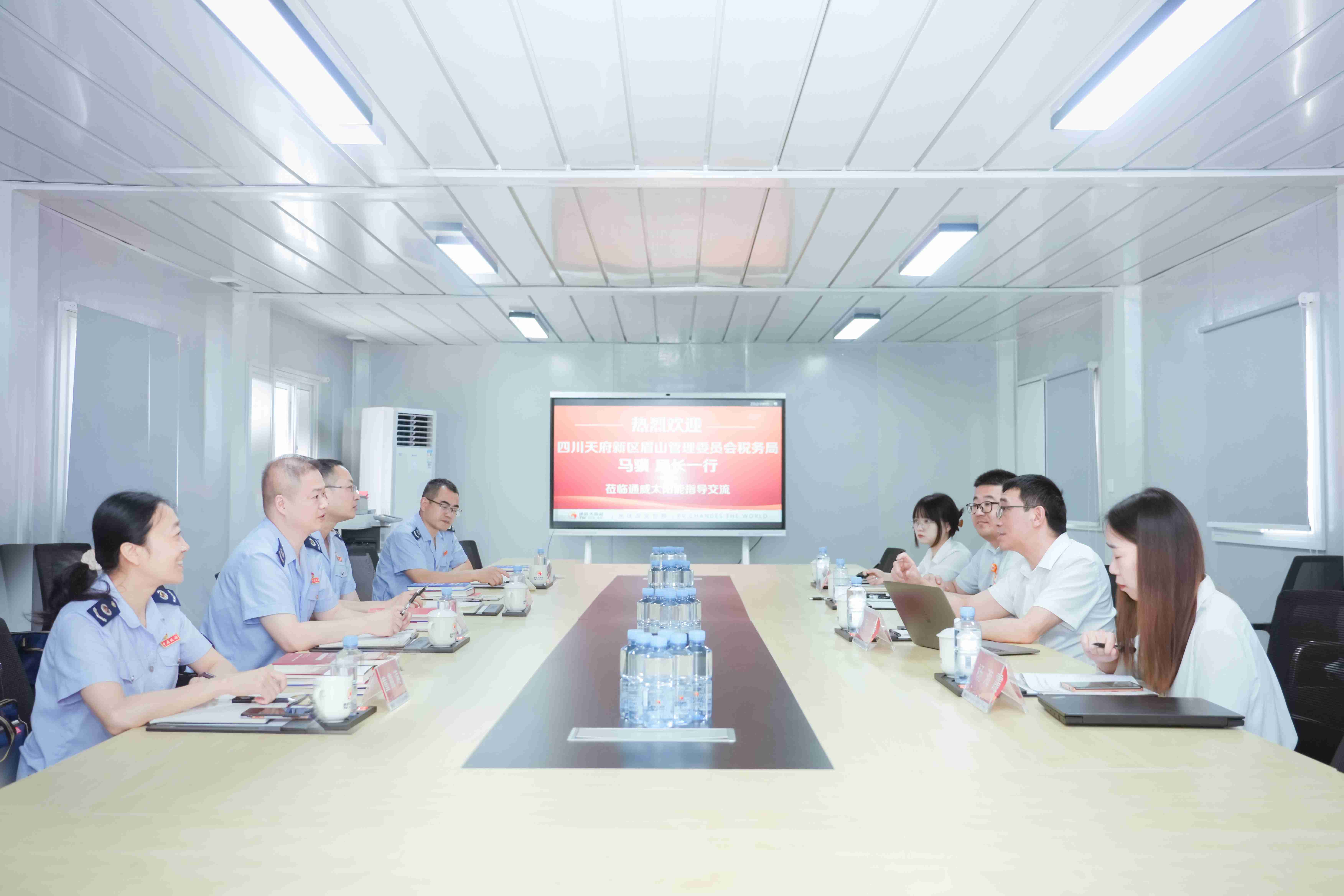 6月14日,眉山管理委員會稅務局局長馬驥一行蒞臨通威太陽能彭山基地指導交流,通威太陽能副總經理宋梟攜彭山基地財務負責人熱情接待并座談。