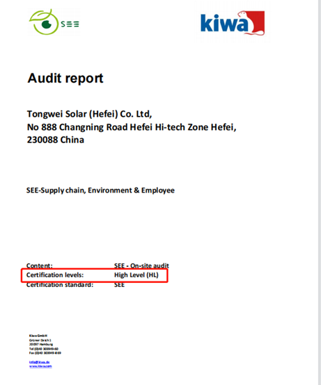 通威太陽能(合肥)有限公司通過Kiwa公司SEE標準認證