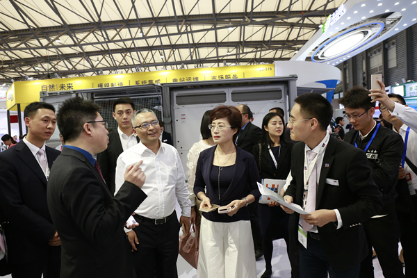禚總一行領(lǐng)導(dǎo)首先來到通威展臺,聽取布展情況匯報,隨后參觀了華為公司展臺,詳細(xì)了解了華為FusionSolar智能光伏解決方案5.0的相關(guān)情況。在亞瑪頓、SMA Solar、南京日托光伏科技有限公司展臺,禚總就雙玻組件、逆變器、太陽能電池片等方面與參展企業(yè)進(jìn)行了交流洽談。當(dāng)天,禚總還受邀出席了陽光電源2017新品發(fā)布會,并作為嘉賓上臺共同啟動新品發(fā)布會裝置。