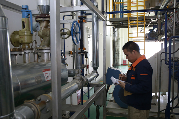 工作人員在膨化機前檢查數(shù)據(jù)