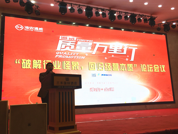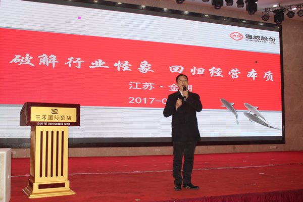 近日,淮安通威在金湖縣三禾國際酒店組織召開以“通威質(zhì)量萬里行——破解行業(yè)怪象,回歸經(jīng)營本質(zhì)”為主題的技術(shù)論壇會議,金湖縣水產(chǎn)技術(shù)推廣站副站長毛國慶、淮安通威總經(jīng)理丁永國及當(dāng)?shù)?00余位養(yǎng)殖戶參會。