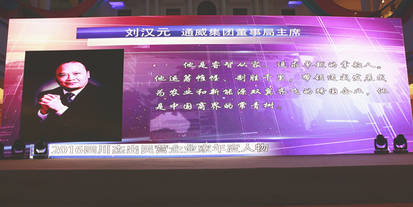 大會隆重舉行了“2016(第五屆)四川杰出民營企業家頒獎典禮”,“2016四川杰出民營企業家年度人物”、“2016四川十大杰出民營企業家”、“2016杰出川商創新獎”、“2016慈善川商獎”、“2016推進川商發展獎”五大榜單逐一揭曉。十一屆全國政協常委、通威集團董事局劉漢元主席榮獲“2016四川杰出民營企業家年度人物”。