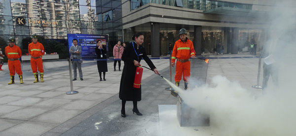 演練結束后,在通威國際中心東側廣場,由秩序部鄧主管現場講解滅火毯、干粉滅火器使用方法,分解動作及消防器材日常維修保養和操作中的注意事項,講解完畢后,大廈各樓層部分辦公人員、物業服務人員進行了實際滅火操練。