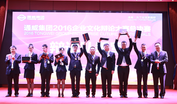 在央視名嘴劉棟棟的主持下, 總決賽于下午13時(shí)30分正式拉開(kāi)序幕,從各輪初、復(fù)賽中脫穎而出的十強(qiáng)戰(zhàn)隊(duì)集結(jié)于此,圍繞“企業(yè)員工的忠誠(chéng)與能力,誰(shuí)更重要?”、“企業(yè)成功是必然還是偶然?”、“企業(yè)管理人性化和剛性化誰(shuí)更重要”等辯題,分五組展開(kāi)了最后角逐,向總冠軍發(fā)起沖刺。經(jīng)過(guò)四個(gè)多小時(shí)的攻防對(duì)峙,十強(qiáng)戰(zhàn)隊(duì)為現(xiàn)場(chǎng)觀眾獻(xiàn)上了一部精彩紛呈的論辯“大片”。臺(tái)上,選手們邏輯清晰,思維敏捷,一展風(fēng)采;臺(tái)下,各拉拉隊(duì)卯足勁為臺(tái)上辯手吶喊助威。大賽專(zhuān)家評(píng)委組根據(jù)各辯手的現(xiàn)場(chǎng)表現(xiàn),綜合考量其辯論水平、表達(dá)能力和臨場(chǎng)狀態(tài)以及團(tuán)隊(duì)配合情況,評(píng)選出優(yōu)勝團(tuán)隊(duì)和個(gè)人獎(jiǎng)項(xiàng)。其中,總部第二戰(zhàn)隊(duì)拔得頭籌,斬獲“通威集團(tuán)2016企業(yè)文化辯論大賽冠軍”殊榮。